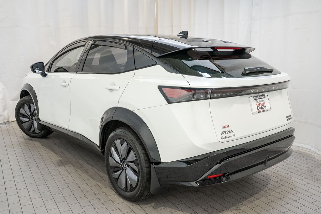 Check out all these great options 19" Alloy Wheels, 4-Wheel Disc Brakes, 6 Speakers, 8.896/7.679 Final Drive Ratio, ABS brakes, Air Conditioning, Alloy wheels, AM/FM radio: SiriusXM, Auto High-beam Headlights, Automatic temperature control, Brake assist, Bumpers: body-color, Carpeted Floor Mats & First Aid Kit, Delay-off headlights, Driver door bin, Driver vanity mirror, Dual front impact airbags, Dual front side impact airbags, Electronic Stability Control, Emergency communication system: NissanConnect EV & Services, Four wheel independent suspension, Front anti-roll bar, Front Bucket Seats, Front Center Armrest, Front dual zone A/C, Front reading lights, Heads-Up Display, Heated door mirrors, Heated Front Bucket Seats, Heated front seats, Heated rear seats, Heated steering wheel, Illuminated entry, Illuminated Kick Plates, Knee airbag, Leather steering wheel, Leatherette Seating Surfaces, Low tire pressure warning, Memory seat, Navigation system: Nissan Door to Door Connected Navigation, Occupant sensing airbag, Outside temperature display, Overhead airbag, Panic alarm, Passenger door bin, Passenger vanity mirror, Power door mirrors, Power driver seat, Power steering, Power windows, Radio: AM/FM Audio System, Rear anti-roll bar, Rear reading lights, Rear seat center armrest, Rear side impact airbag, Rear window defroster, Rear window wiper, Remote keyless entry, Security system, Speed control, Speed-sensing steering, Speed-Sensitive Wipers, Split folding rear seat, Spoiler, Steering wheel mounted audio controls, Telescoping steering wheel, Tilt steering wheel, Traction control, Trip computer, and Variably intermittent wipers *** AVAILABLE AT FRED ANDERSON NISSAN OF RALEIGH. CALL US NOW 919-787-0254*** Nissan Certified. Ariya Everest White Pearl Tricoat/Black Diamond Pearl ENGAGE e-4ORCE AWD CVT Electric Motor