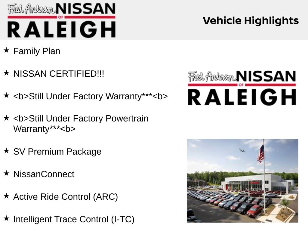Recent Arrival! Clean CARFAX. CARFAX One-Owner. Family Plan, NISSAN CERTIFIED!!!, *Still Under Factory Warranty***, Still Under Factory Powertrain Warranty***, Active Ride Control (ARC), Body-Colored Outside Mirrors, Electronic Parking Brake w/Auto-Hold, Exhaust Finishers, Heated Front Seats, Intelligent Cruise Control w/Full Spd Range & Hold, Intelligent Lane Intervention (I-LI), Intelligent Trace Control (I-TC), Leather Shift Knob, Leather Steering Wheel, NissanConnect, Premium Interior Finishers, ProPILOT Assist, Single Panel Moonroof, Steering Assist, SV Premium Package, Traffic Sign Recognition.